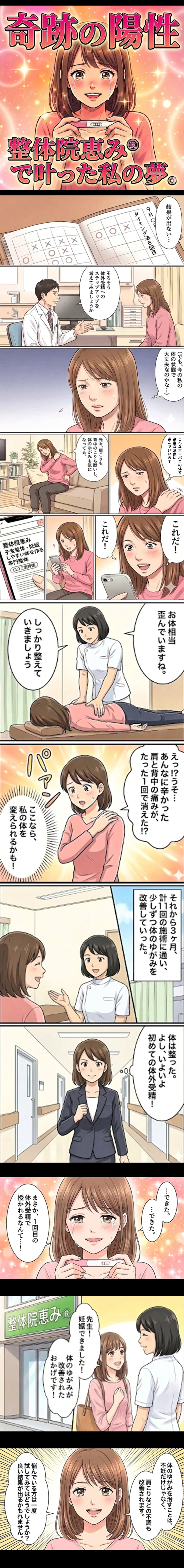 当院の施術「こつばんバランス子宝療方®」の施術を受けて、妊娠された方の感想をもとに漫画を作りましたので参考にしてください。