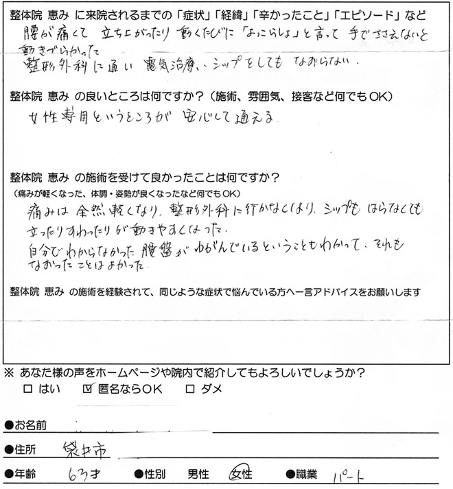 【整体院恵みの施術を経験されて、同じような症状で悩んでいる方へ、一言アドバイスをお願いします。】
